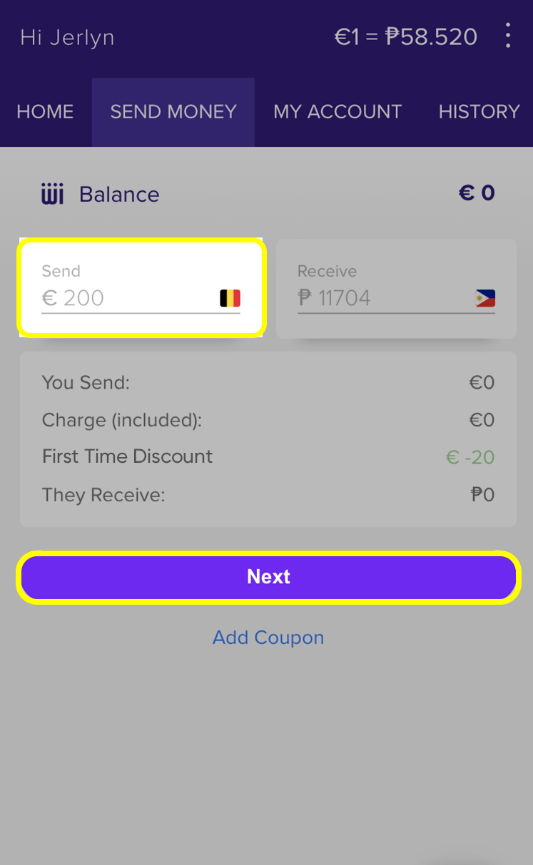 Enter the amount you want to send (in euros or in pesos for this example or any other currency you are sending) into the calculator. You will see how much you will exactly receive based on today's rate. Click on Next once you are ready.