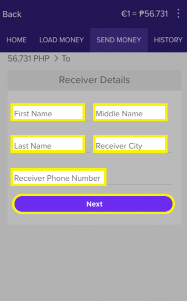 Enter the Receiver's details (first name, last name, receiver city, receiver phone number).