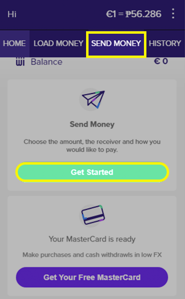 In order to create an order to Send Money with Rewire, click on the Send Money tab or the Get Started button on the homepage.