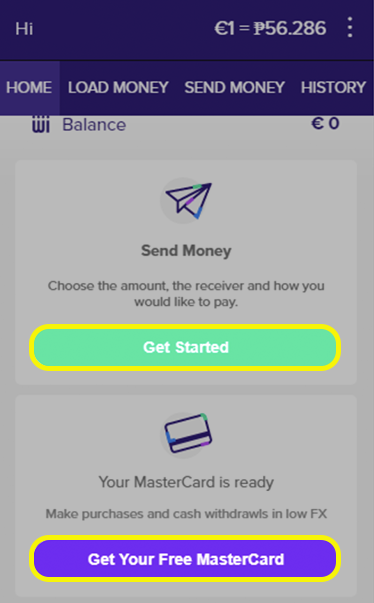Now you can choose what you want to do next - To start sending money click "Get Started" or to order your MasterCard Debit click "Get Your Free MasterCard". If you just want to setup an IBAN Account Click here for a guide.