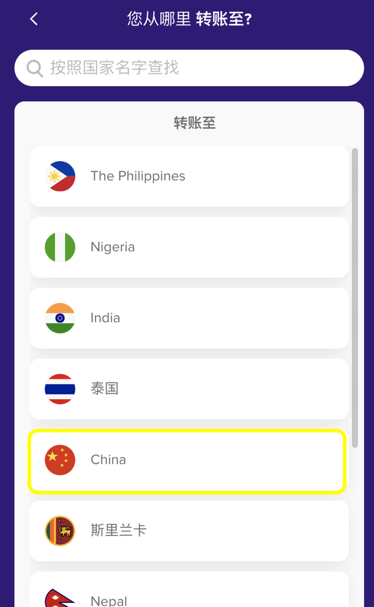 Click on the Country you would like to send your money to.