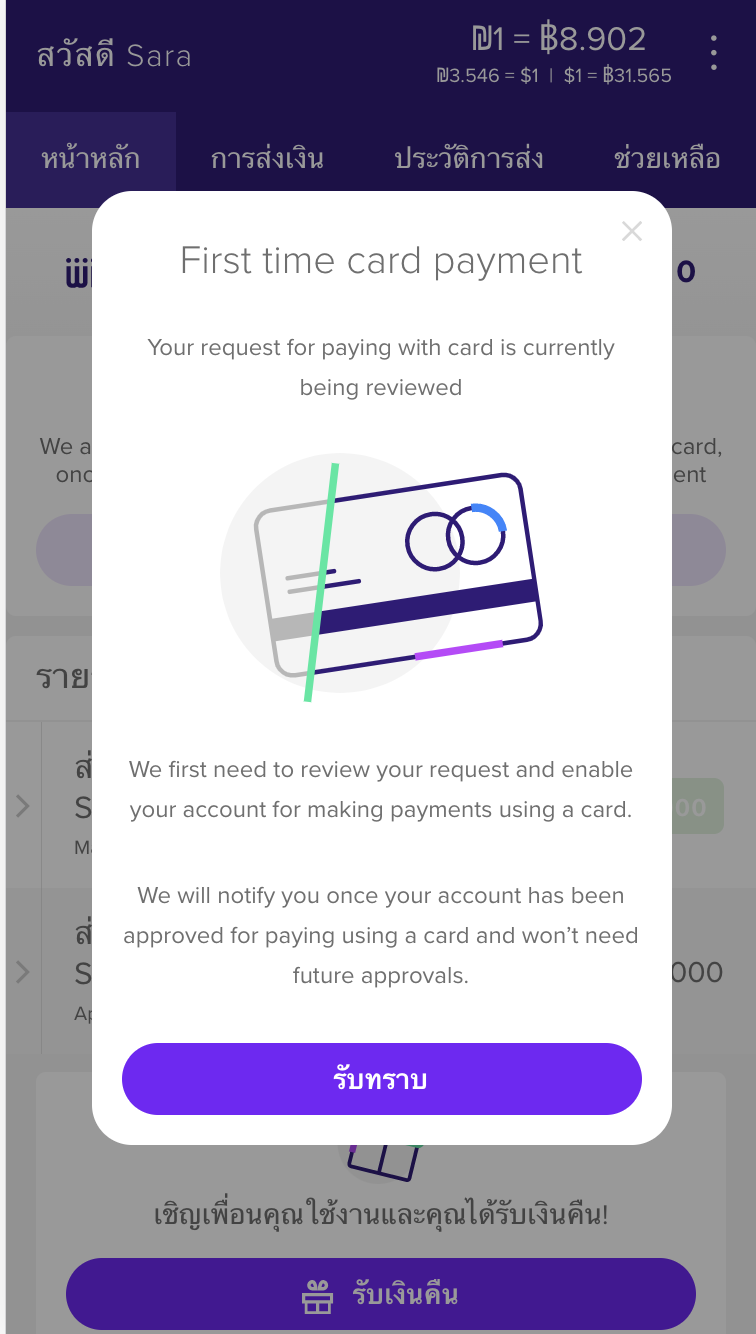 หากนี่เป็นครั้งแรกที่คุณชำระเงินด้วยบัตร เราต้องตรวจสอบคำขอของคุณและเปิดใช้งานบัญชีของคุณเพื่อชำระเงินด้วยบัตร