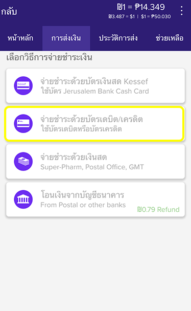 ตอนนี้คุณจะต้องตัดสินใจว่า คุณต้องการฝากเงินเข้าที่บัญชี Rewire อย่างไร เลือก ชำระด้วยบัตรเครดิต คุณสามารถทำรายการด้วยบัตร Visa, Direct Card, MasterCard และ Isracard ทั้งหมด โปรดทราบจะต้องเป็นบัตรที่ออกในประเทศอิสราเอลเท่านั้น