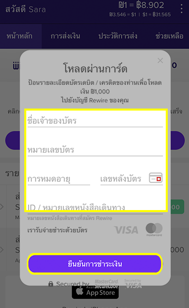 หากต้องการโอนเงินผ่านธนาคารจากบัตรเครดิต / เดบิตของคุณ กรุณาตรวจสอบให้แน่ใจว่า คุณได้ ลงทะเบียนใช้บัญชีRewire หากคุณมีบัญชีแล้ว ลงชื่อเข้าใช้ บัญชีของคุณ