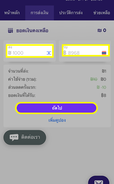 ใส่จำนวนเงินที่ต้องการจะโอน ช่องด้านขวาจะระบุจำนวนเงินบาทที่จะได้รับ บรรทัดสุดท้ายในช่องการคำนวน จะแสดงจำนวนเงินหลังหักจากหักค่าใช้จ่ายในการโอนและส่วนลด เป็นจำนวนเงินที่จะเข้าบัญชีธนาคารที่เมืองไทย จากนั้นคลิกที่ ต่อไป