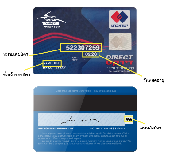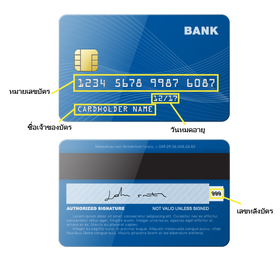 ป้อนชื่อของคุณที่แสดงบนบัตร หมายเลขบัตร  วันหมดอายุ  เลขหลังบัตร หมายเลขด้านหลังบัตร และหมายเลข หมายเลขหนังสือเดินทาง จากนั้นคลิก ยืนยันการชำระเงิน ดูภาพด้านล่างเพื่อดูว่าจะหารายละเอียดเหล่านี้บนการ์ดของคุณได้จากที่ใด