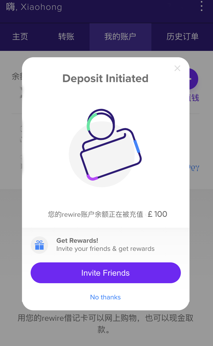 There will be a pop up to confirm that your Rewire account has been credited. Click the X button to acknowledge the credit. The credit will be reflected once the transfer was received. This usually takes a few minutes on the Home page.