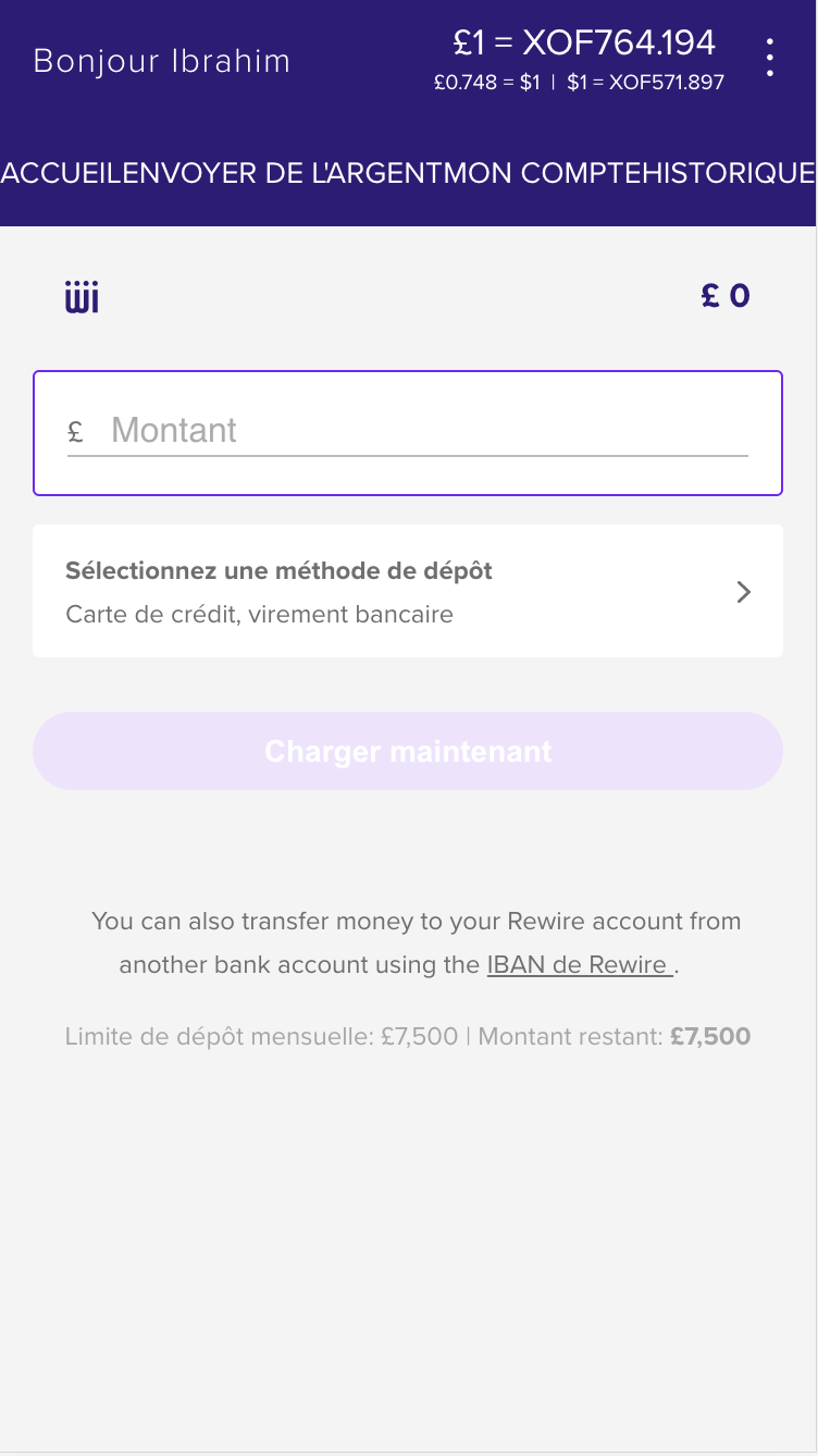 Ces étapes vous guideront pour charger de l’argent sur votre compte Rewire IBAN. Vous avez quelques options pour charger de l’argent par carte de crédit, virement bancaire immédiat et virement depuis votre banque.