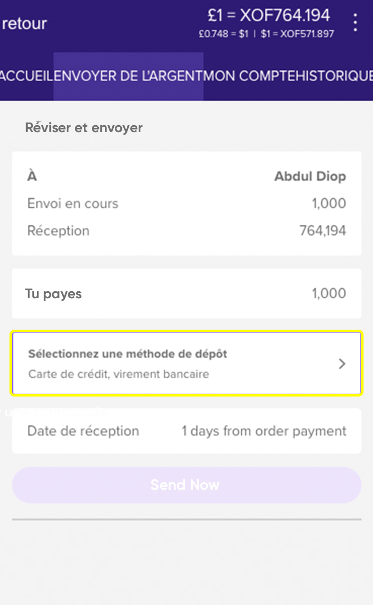 Vous pouvez également charger de l'argent pendant le processus de transfert d'argent, cliquez sur "sélectionner la méthode de dépôt"