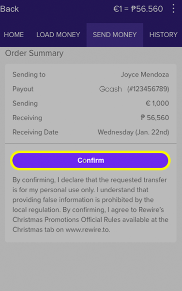 Take note of the expected date you will receive the payment in your receiving country. Click on Confirm to confirm the order. If you haven't yet loaded money to your Rewire account