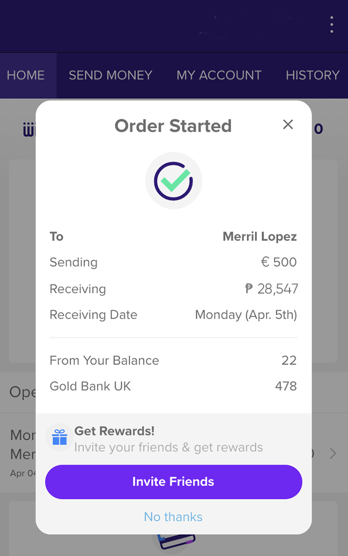 Once the money reaches your beneficiary, we will send you a confirmation and the relevant claiming information by SMS and it will also be shown on your Rewire Home and History tab.