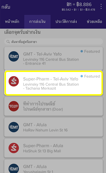 คุณทราบหรือไม่? ว่าคุณสามารถส่งเงินกลับไทยโดยที่ฝากเงินเข้าบัญชี Rewire ของคุณได้ที่ Super-Pharm ไม่ต้องรอคิวนานอีกต่อไป ให้ขั้นตอนง่าย ๆ เหล่านี้ช่วยคุณหากต้องการค้นหาสาขา Super-Pharm ที่เข้าร่วมรายการหรือสาขาที่คุณสามารถฝากเงินได้ สาขาที่ใกล้ที่สุด คลิกที่นี่ เพื่อดูบนแผนที่ คลิกที่นี่