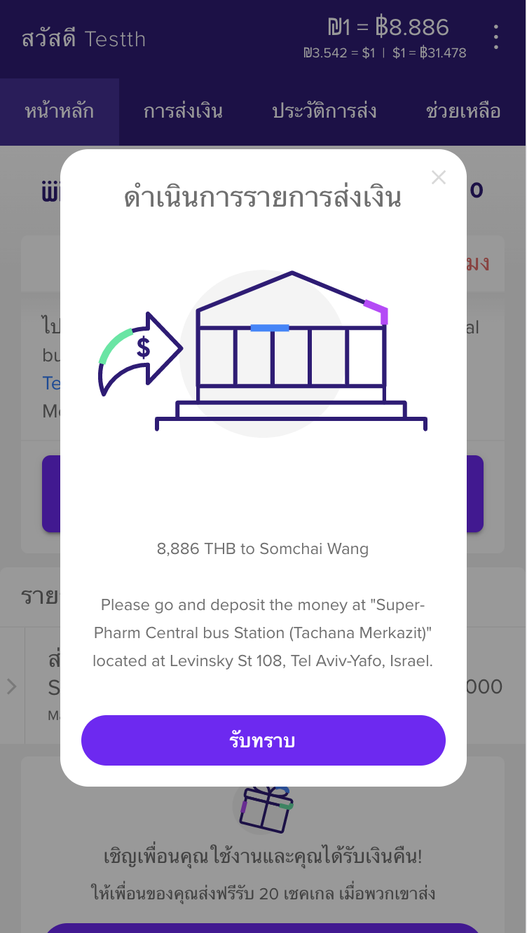 ตอนนี้คุณจะต้องทำการฝากเงินสดไปที่สาขา ซุปเปอร์ฟาร์ม ที่คุณเลือกภายใน 2 ชั่วโมง รายการส่งเงินของคุณอาจถูกยกเลิก หากคุณไม่ได้ดำเนินการฝากให้เสร็จสิ้นภายในหนึ่งวัน