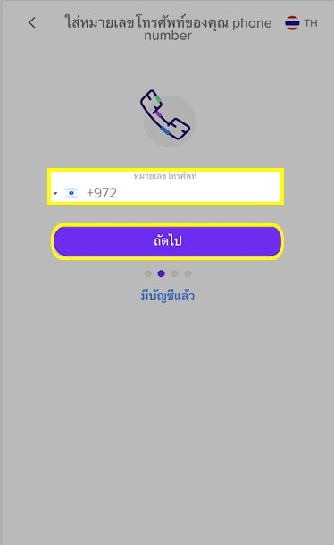 กดเลือกรหัสประเทศ (+972) แล้วกรอกหมายเลขโทรศัพท์ของคุณที่ต้องการสมัคร แล้วกด ถัดไป
